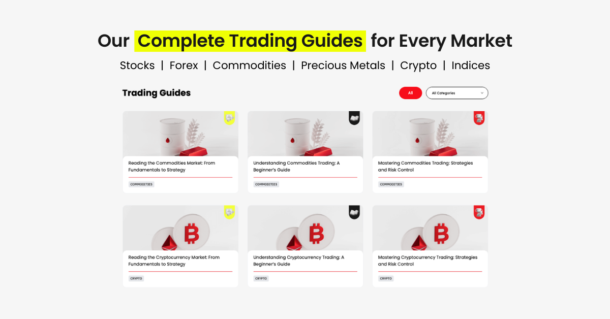 Comprehensive guides covering Stocks, Forex, Commodities, Precious Metals, Crypto, and Indices. These guides are particularly helpful for those researching how to trade different instruments, including traders interested in stock trading, those exploring forex trading for beginners, or investors learning how to invest in gold effectively.