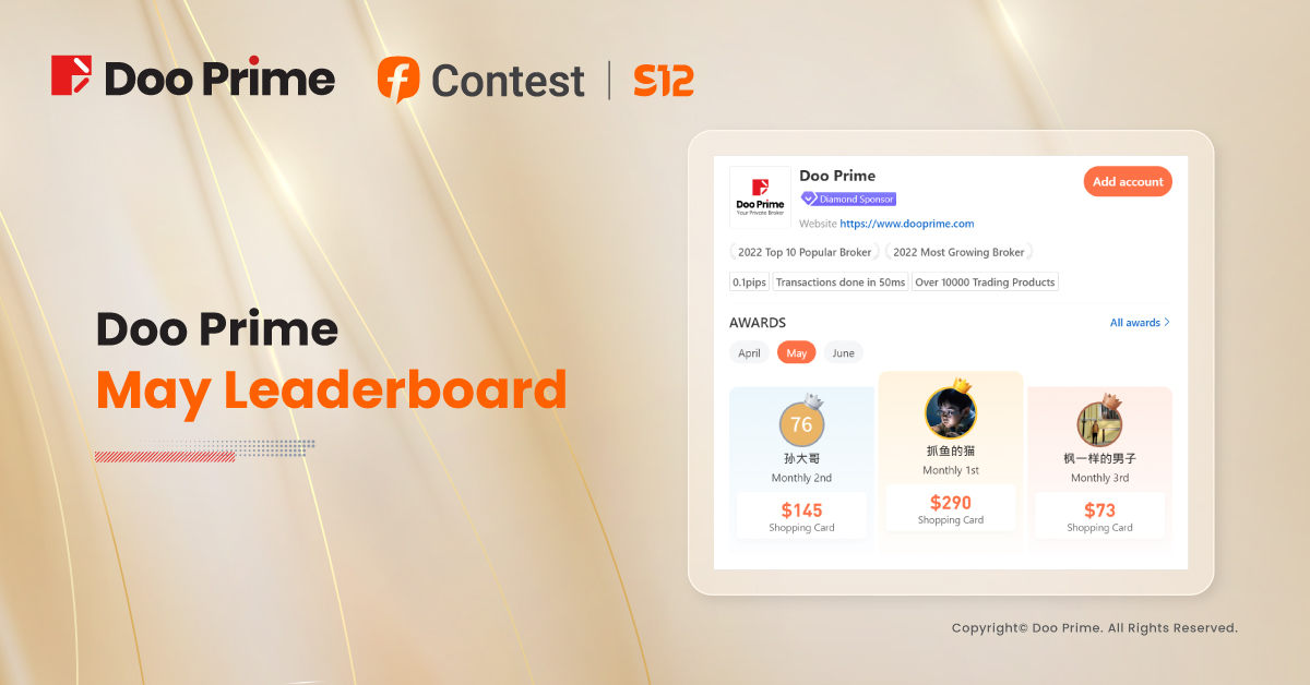 With the arrival of June, the monthly results of the FOLLOWME S12 Competition for May have also been released. Doo Prime, as the diamond sponsor of this S12 trading contest, will distribute over USD 500 in bonuses each month among the top three performers on the leaderboard.