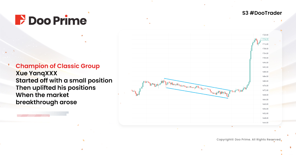 During a sideways market, Xue YanqXXX started off with a small position during the slight dip within a narrow range, and then uplifted his positions when the market breakthrough arose.