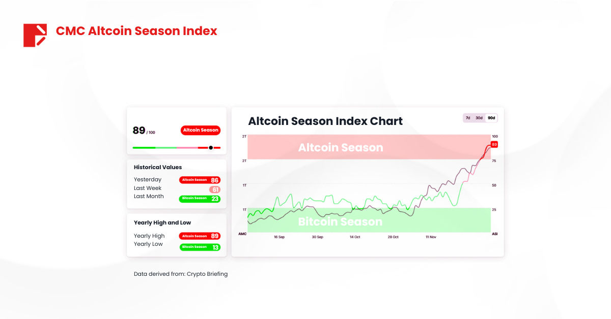 On December 6, 2024, the Altcoin Season Index hit its highest value of the year, reaching 89 out of 100. This index measures how many of the top 100 cryptocurrencies by market capitalization are outperforming Bitcoin (BTC) over a rolling 90-day period. To put this into context, an index value above 75 signals the start of an altcoin season, while 89/100 suggests that an overwhelming majority of altcoins are currently outperforming Bitcoin.
