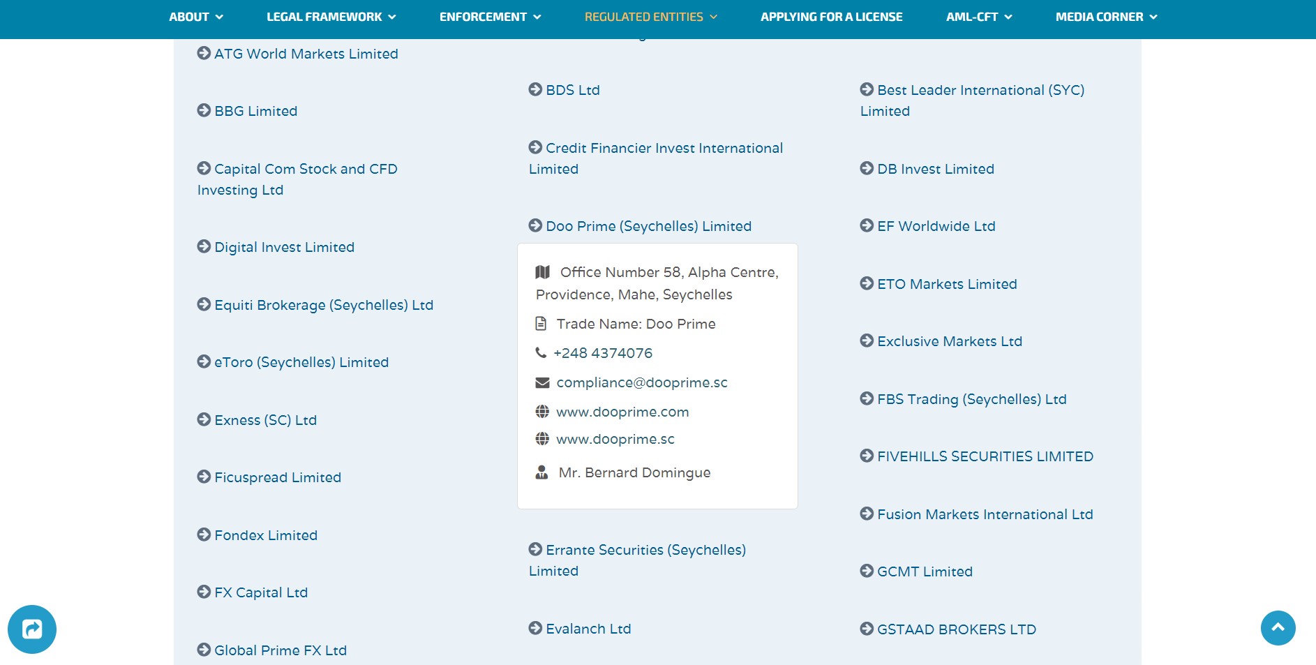Step 5: Please click on “Doo Prime (Seychelles) Limited”. The details of the firm will be shown, including office address, company email and website and compliance officer as below.