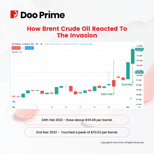 On the first day of the invasion, 24th February 2022, oil prices jumped, with Brent rising above $105 per barrel for the first time since 2014.