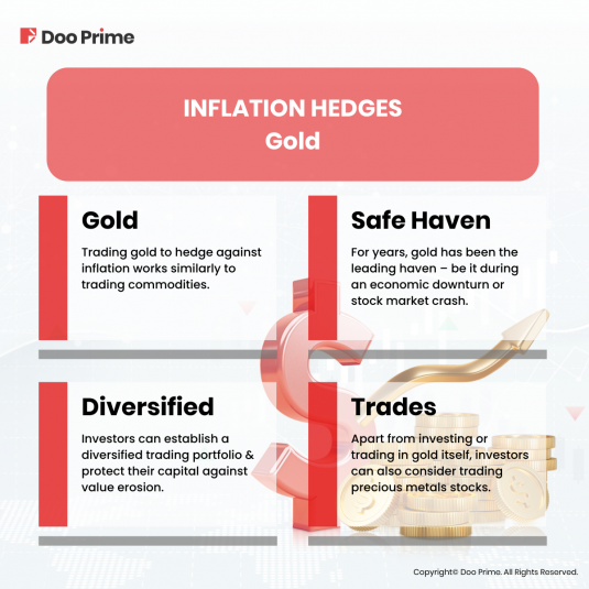 Trading gold to hedge against inflation works similarly to trading commodities. Their values are both measured and traded with the U.S. dollar. On top of that, oil and gold’s value rise along with inflation as well.