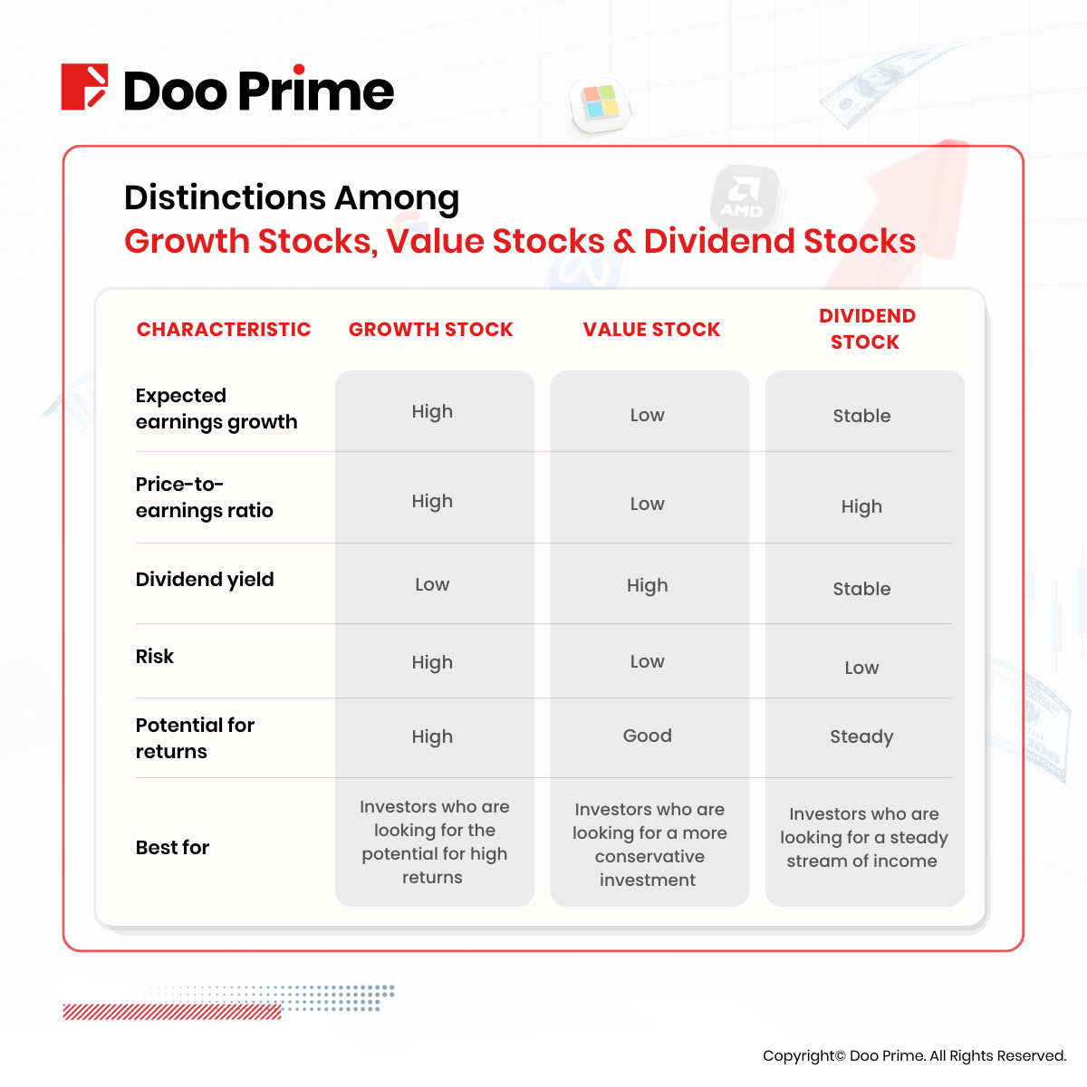 To provide a clearer understanding of the distinctions among growth stocks, value stocks, and dividend stocks, the following table summarizes their key differences: