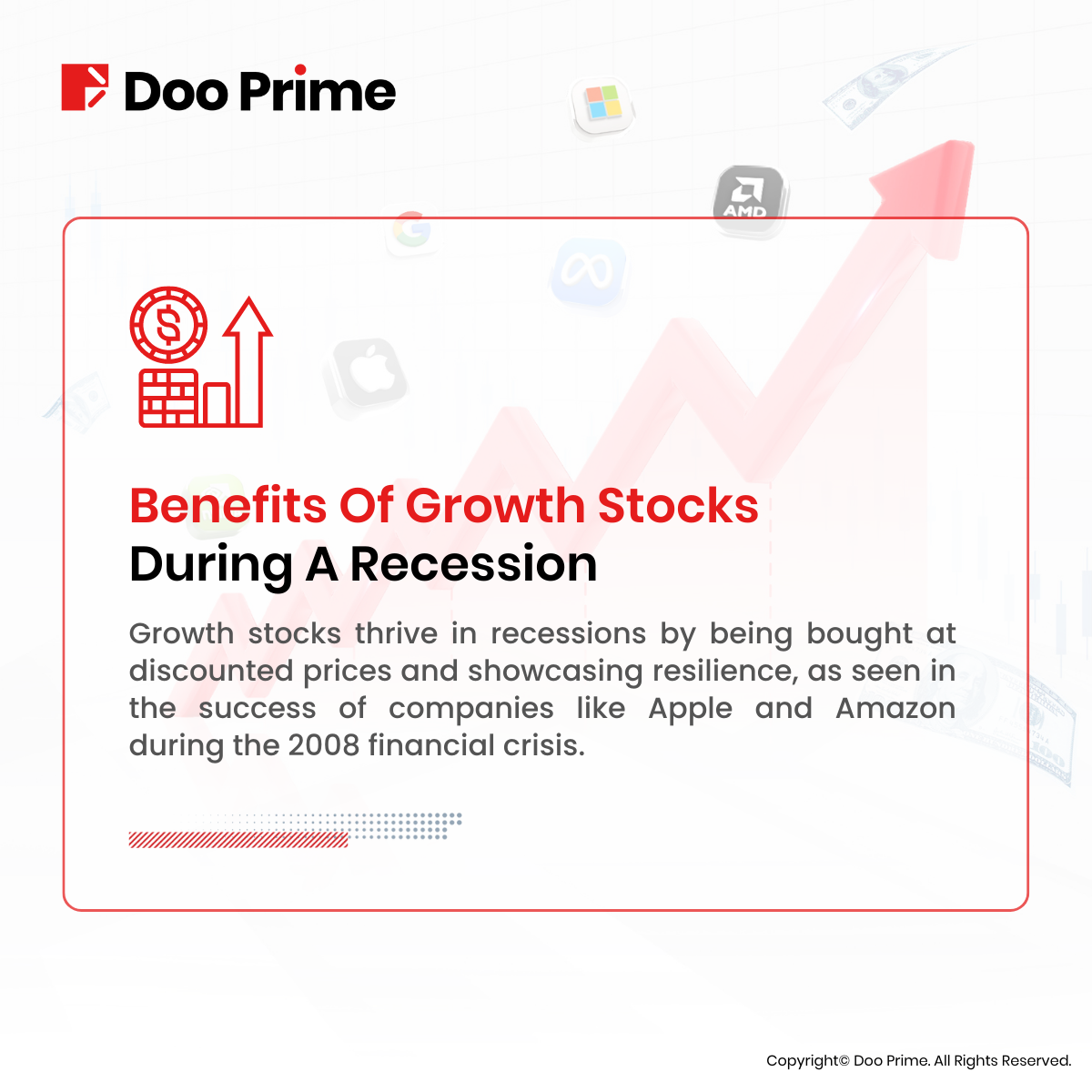 Another benefit is resilience. Growth stocks can be more resilient in challenging market conditions than other types of stocks. For example, during the 2008 financial crisis, many growth stocks, such as Apple & Amazon, continued to perform well, even as the overall market declined.