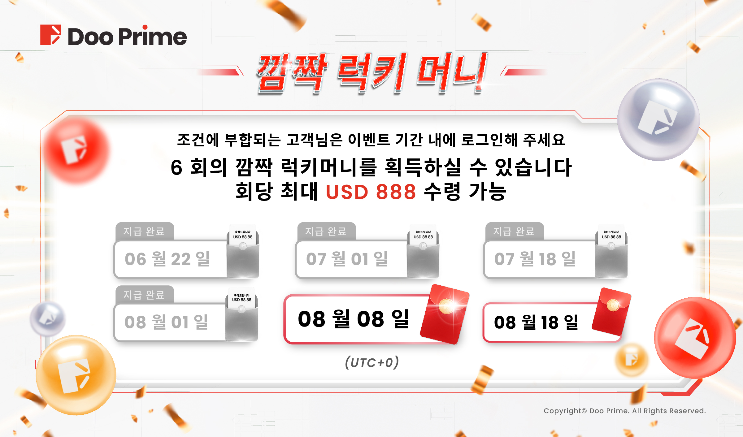 Doo Prime 글로벌 연중 추첨 이벤트는 론칭 이후 글로벌 고객의 참여 열기가 나날이 뜨거워졌습니다. 지금까지 우리는 총 10,000+의 프리미엄 선물과 막대한 보너스를 증정하였습니다! 현재 이벤트가 한 달밖에 남지 않은 상황에서 고객님들에게 더 많은 서프라이즈를 선사하기 위해 이벤트 레벨을 한층 더 업그레이드하였습니다. 더 많은 프리미엄 선물들로 한여름의 거래 여정을 빛내세요.