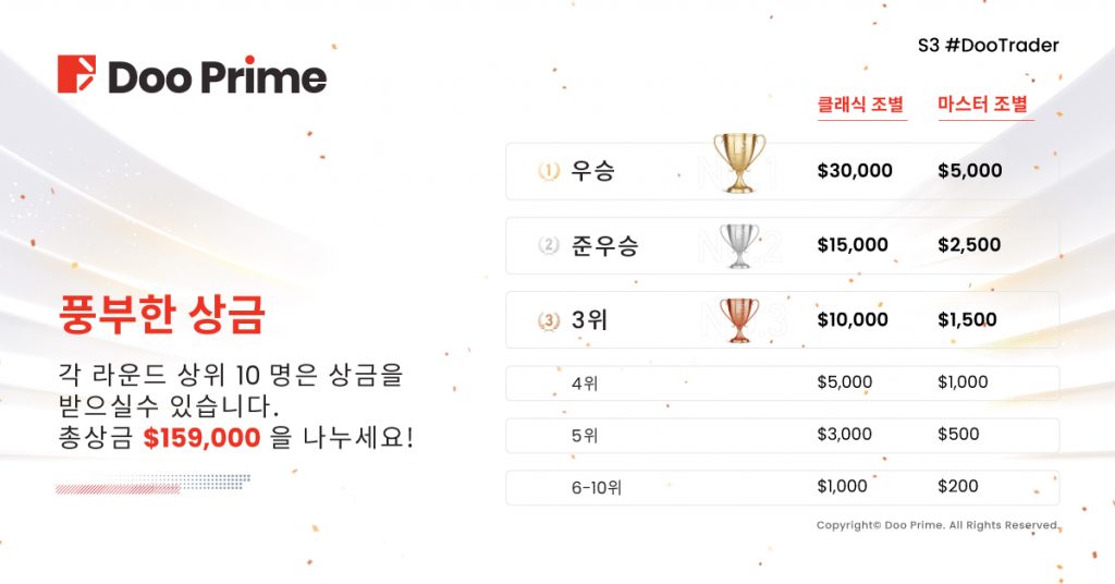 고대했던 S3 #DooTrader 글로벌 자선 트레이딩 대회가 오늘 정식으로 시작되었습니다! 3회째를 맞이하여 이번 대회 상금풀은 159,000 달러로 업그레이드 되었습니다. 전 세계 거래자들이 이 자선 트레이딩 대회에 참여하여 본인들의 거래 실력을 발휘하여 최고의 영예와 상금을 쟁취하시기 바랍니다.