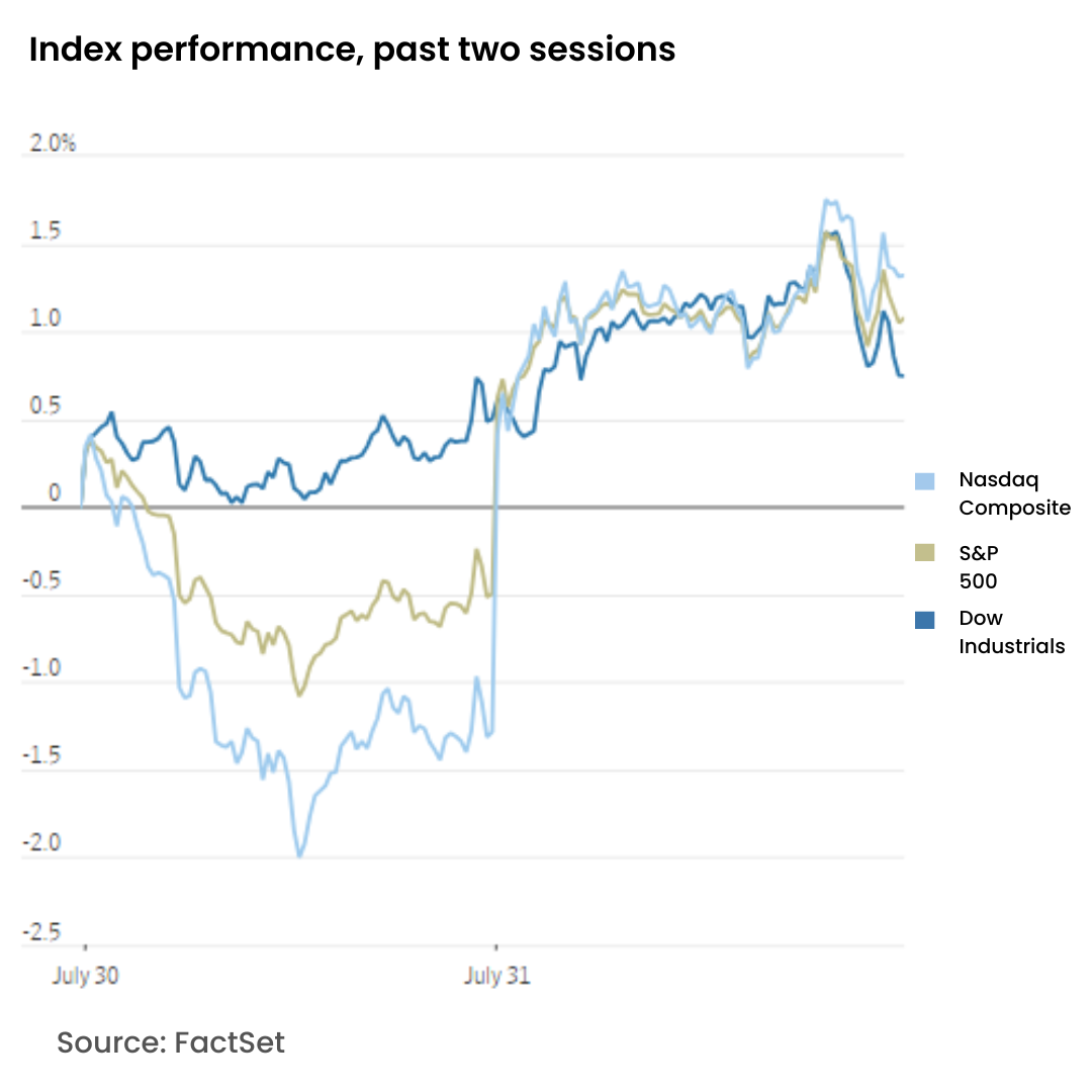 For July, the S&P 500 and Dow saw overall monthly gains of 1.1% and 4.4%, respectively, although the Nasdaq slightly declined by 0.8%. Despite some volatility throughout the month, Wednesday’s trading indicated sustained investor interest in major tech firms.