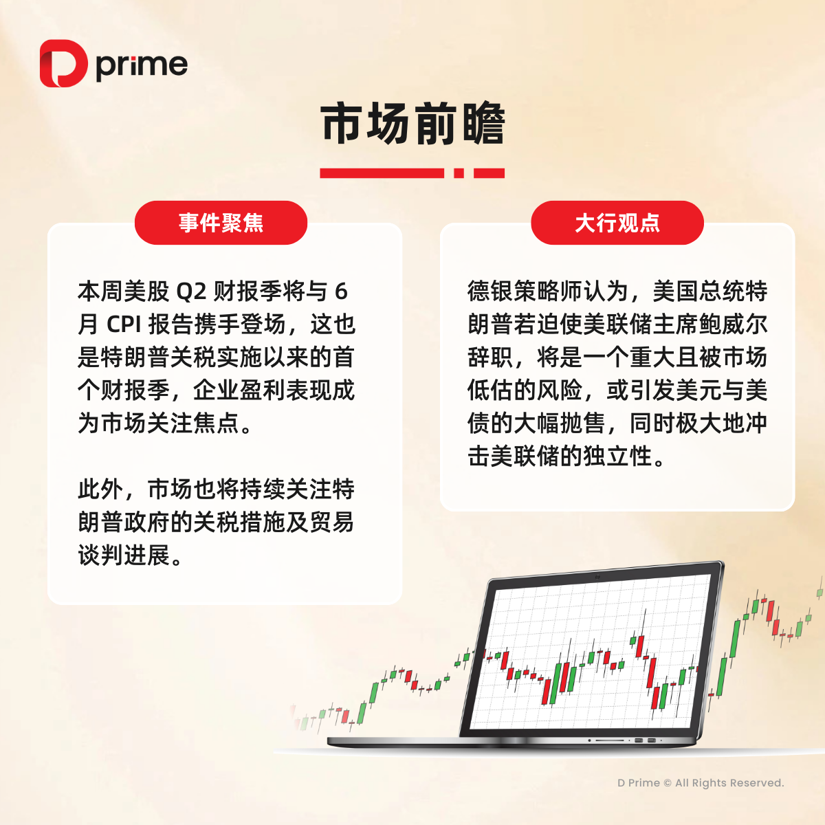 精选研报 | 在刚刚过去的周末,特朗普关税政策再传大消息!美联储主席鲍威尔 “辞职风波” 再起,德银分析师直言 “鲍威尔被迫离职” 是重大且被低估的风险。本周,美股 Q2 财报季将携手 6 月 CPI 报告登场,这也是特朗普关税实施以来的首个财报季,企业盈利表现备受关注。还有哪些市场焦点值得留意?下方图片速览: