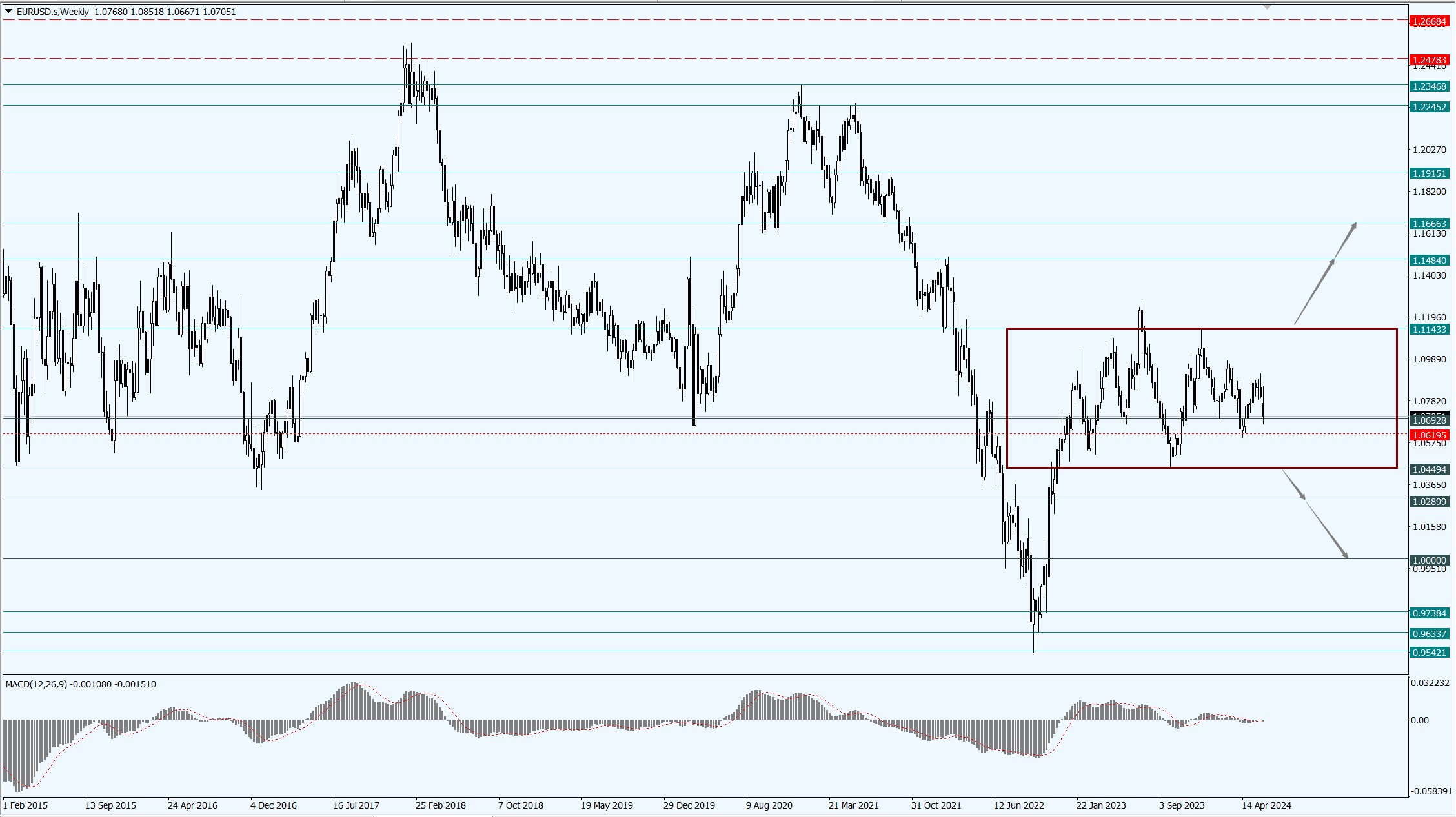 • 从技术层面上,下周主要关注周多空分届 104.08 一线,如果美指运行于 104.08 一线上方,届时则关注区间上边界 107.20 和 109.38 两个位置的压制力度,尤其关注震荡区间上边界 107.20 一线的压制力度;