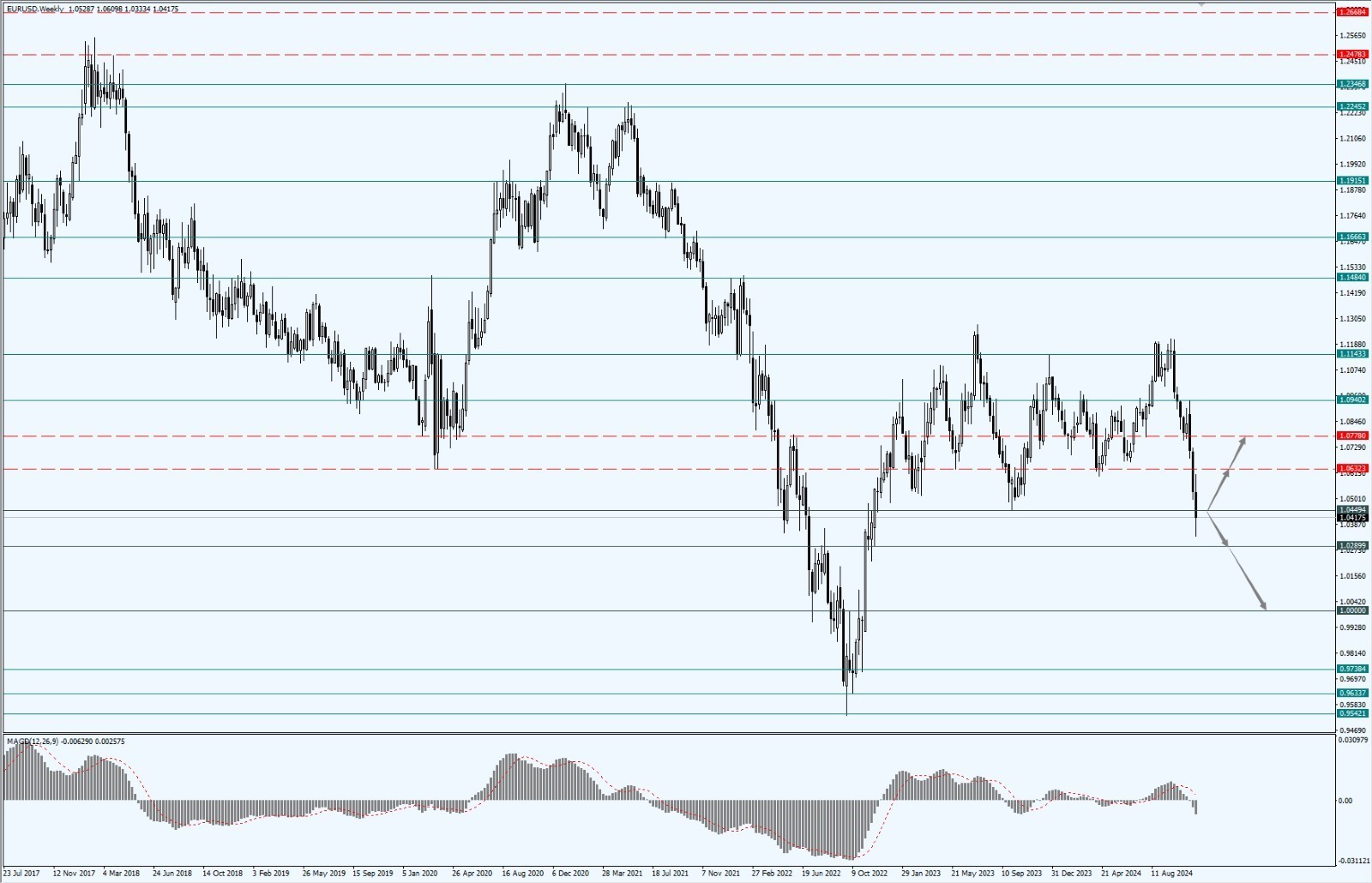 - 上周欧元持续下行,力度跌破 1.0449 一线,整体空头势能依旧强劲;