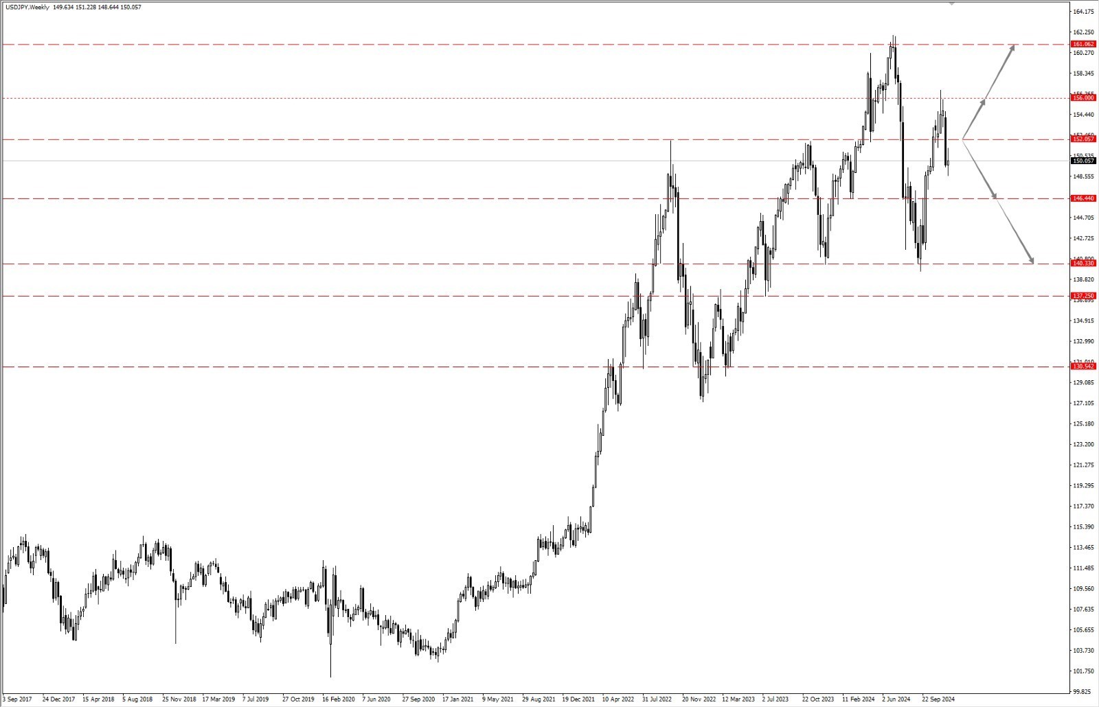 • 如果美元兑日元运行于 152.05 一线下方,则依次关注 146.44 和 140.33 两个位置的支撑力度;