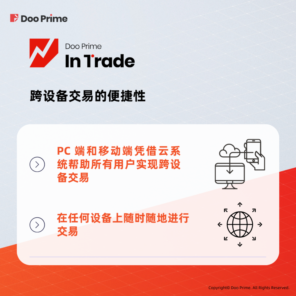 “轻松访问”是任何平台或应用程序的关键。 Doo Prime InTrade 的 PC 端和移动端凭借云系统帮助所有用户实现跨设备交易。用户可以在任何设备上随时随地进行交易,及时把握投资机遇。