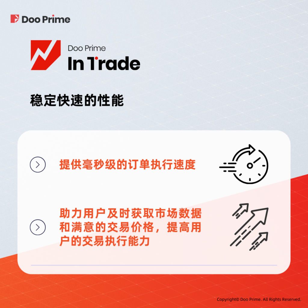 Doo Prime InTrade 提供毫秒级的订单执行速度,仅需 50 毫秒即可完成一笔交易。如此高效的性能使 Doo Prime 能够在极短的时间内处理许多实时报价数据和客户订单,为客户提供极速交易体验。