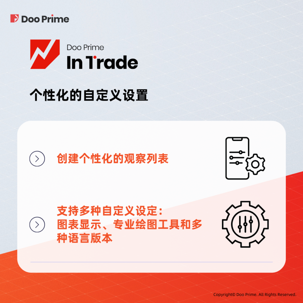 Doo Prime InTrade 的功能全面、高效,凭借 Doo Prime 的尖端金融科技技术,其交易体验和功能一步步突破各种限制,全面实现一键完成环球投资。