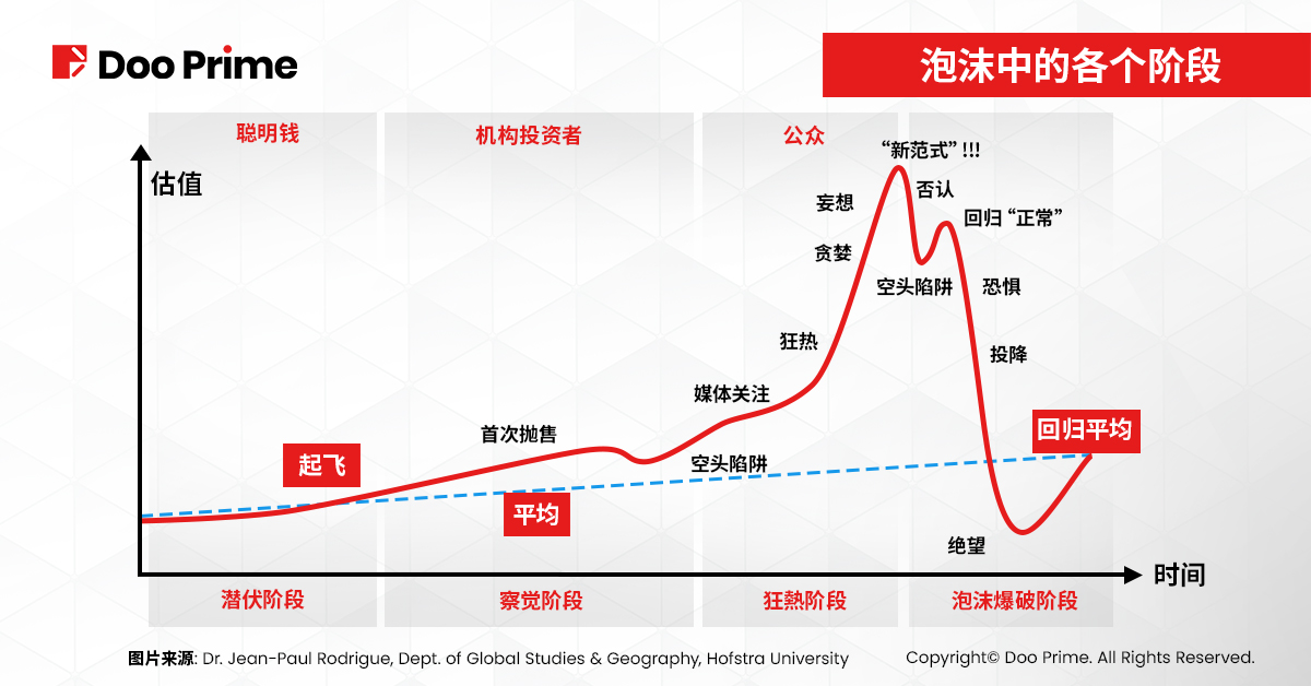 尽管每个市场泡沫都是独特的,但它们往往会遵循一个明确的模式来发展,这个模式在过去 500 年的金融史中亦曾反覆出现,通常分成四个阶段: