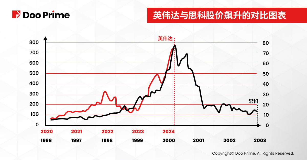 为了让我们了解到半导体股潜在的风险和回报,与历史事件进行比较是至关重要的。将思科在 2000 年互联网泡沫期间的轨迹与英伟达目前的轨迹进行比较,可以看到思科曾经也历过一轮飙升后再暴跌,这提醒我们要更加小心审慎。