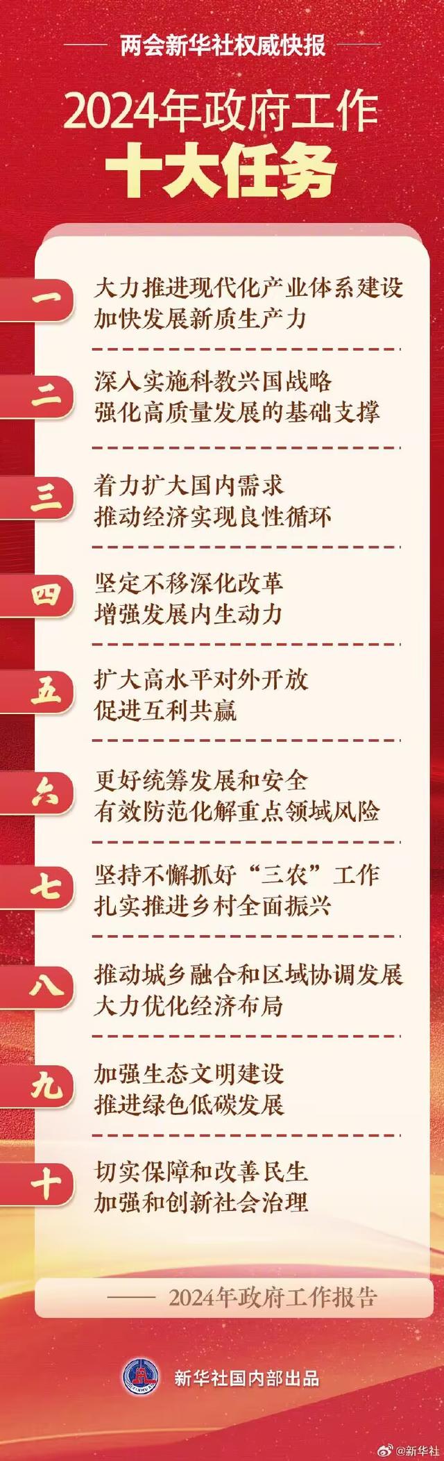 政府工作报告说,今年是中华人民共和国成立 75 周年,是实现“十四五”规划目标任务的关键一年。报告中同时也明确了 2024 年政府工作十大任务。