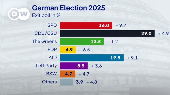 • 德国保守党基民盟(CDU)和巴伐利亚盟友基社盟(CSU)组成的联盟党以约 29% 的支持率赢得胜利;