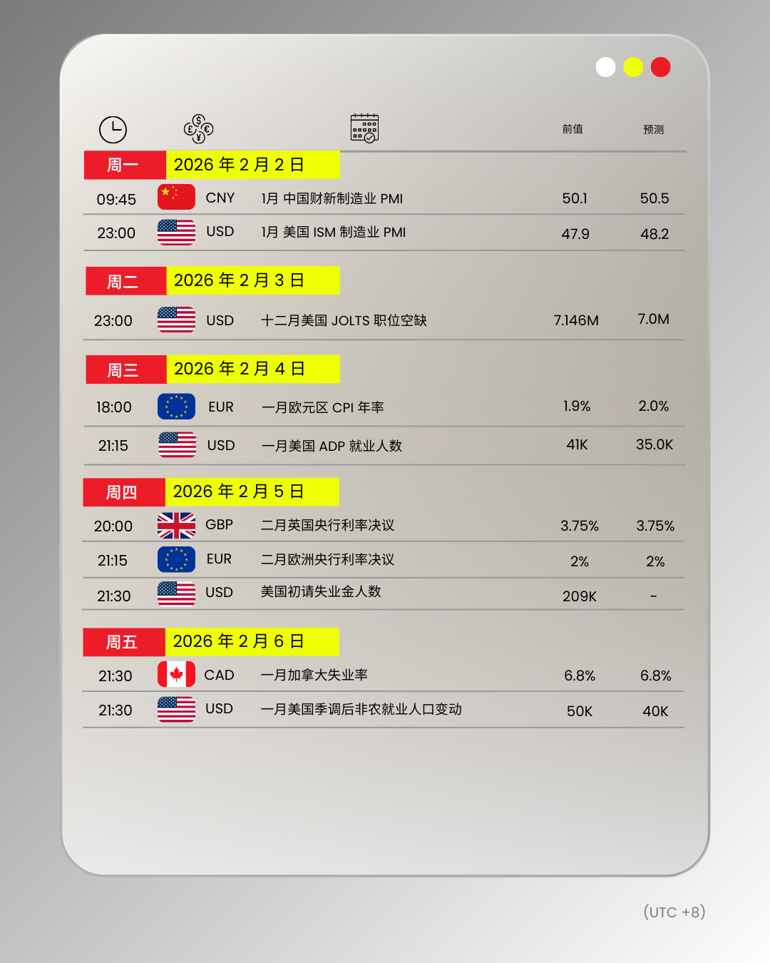 财经日历 | 以下为 2026 年 2 月 2 日至 2026 年 2 月 6 日(GMT+8 北京时间) 全球重大经济事件提醒。在重大行情期间,请确保您已审查您的保证金率,并有足够的保证金来支撑您的风险敞口。