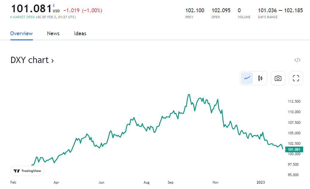美元指数跌幅一度收窄至 0.1%,上逼 102,但 10 分钟内,美元指数跌幅扩大至近 1%,交投 101.10 附近并刷新日低。