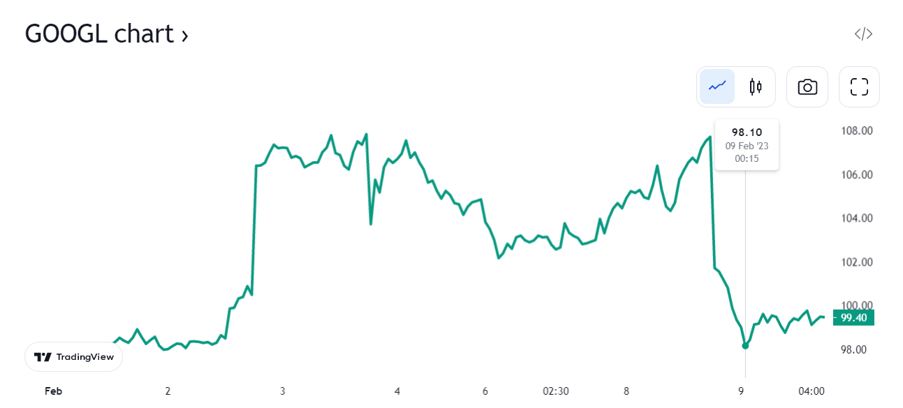 2 月 8 日,谷歌在官方宣传 AI 聊天机器人 Bard 的演示视频中犯了一个明显错误,其股价随即断崖式下跌,盘中跌近 10%,刷新日低至约 98 美元,市值蒸发超过 1000 亿美元。