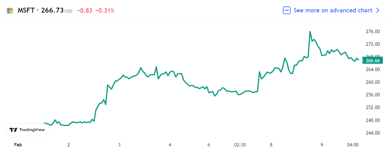 微软股价随后转跌 0.3%,仍徘徊五个半月高位,报 266.73 美元。
