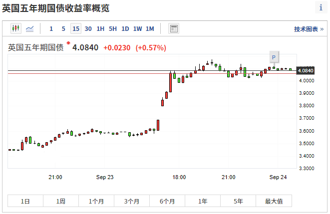 截至上周五,5 年期英国国债收益率日内升幅一度接近 60 个基点,创史上最大升幅,基准 10 年期英债收益率日内升幅超过 30 个基点,也创最大单日升幅。