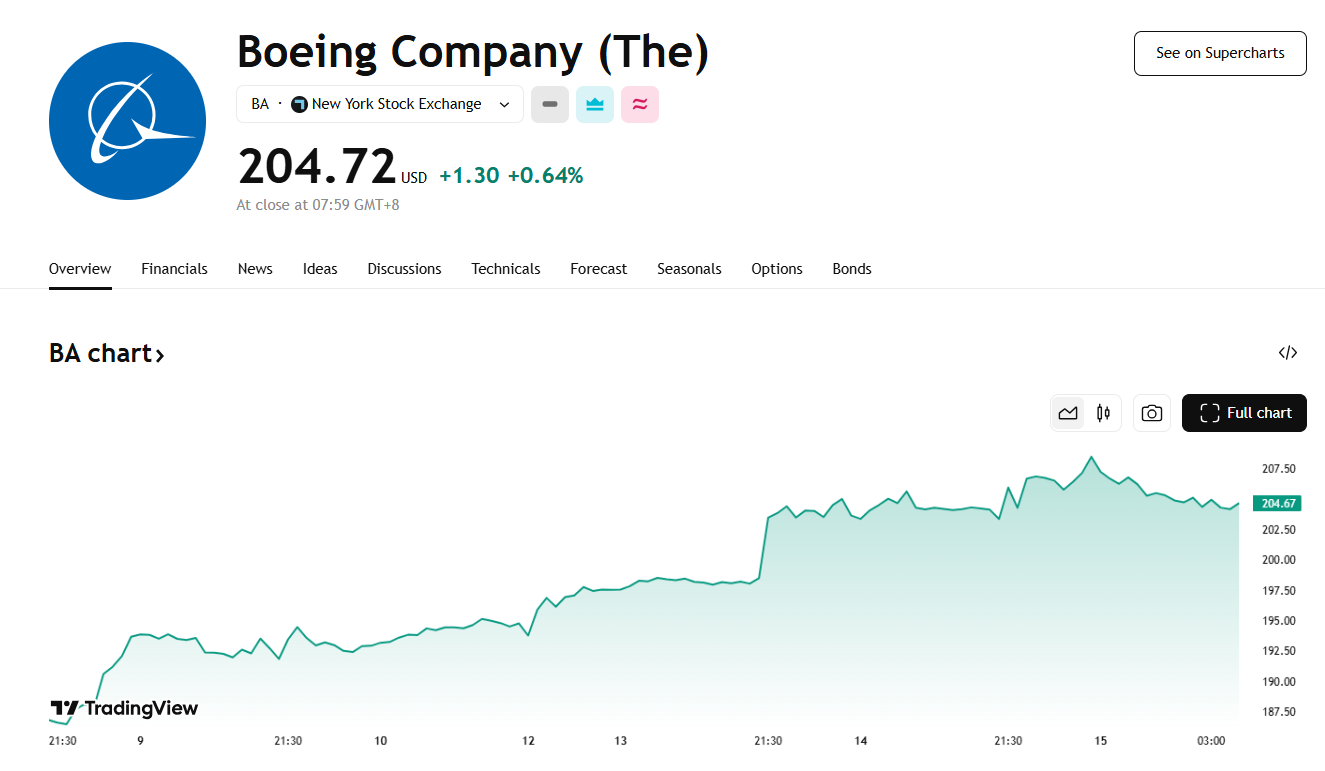 特朗普宣布卡塔尔航空将购买160架波音宽体飞机后,周三美股早盘,波音的股价涨幅迅速扩大,一度涨近 3.1% 至 209.66 美元,创 2024 年 2 月 12 日以来盘中新高,午盘逐步回吐多数涨幅,收涨逾 0.6%。