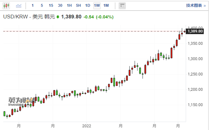 韩国政府如此紧张的背后是,韩元正在遭遇贬值风暴。截至 19 日,韩元兑美元汇率已跌至 1395.18,为 2009 年 3 月以来的最低水平,而且正在逼近 1400 关键心理关口。自俄乌冲突以来,韩元兑美元汇率的累计跌幅已经接近 15%。