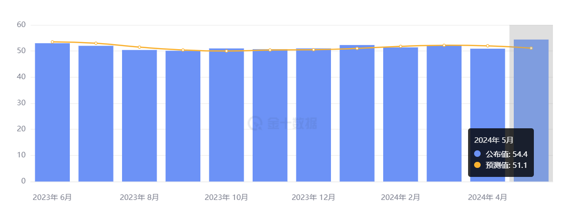 • 服务业 PMI 初值 54.8,创 12 个月新高,高于预期的 51.2 和前值 51.3;