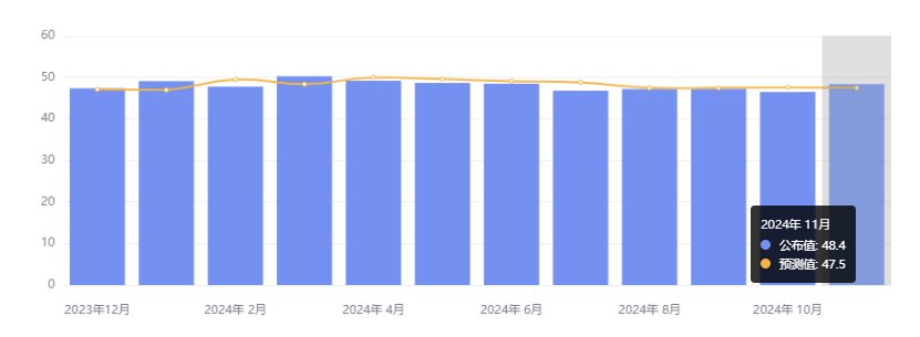 美国 11 月 ISM 制造业 PMI 指数 48.4,高于预期的 47.6 和 10 月前值 46.5,创今年 6 月以来的最高水平,也是今年 3 月以来的最大月度涨幅。