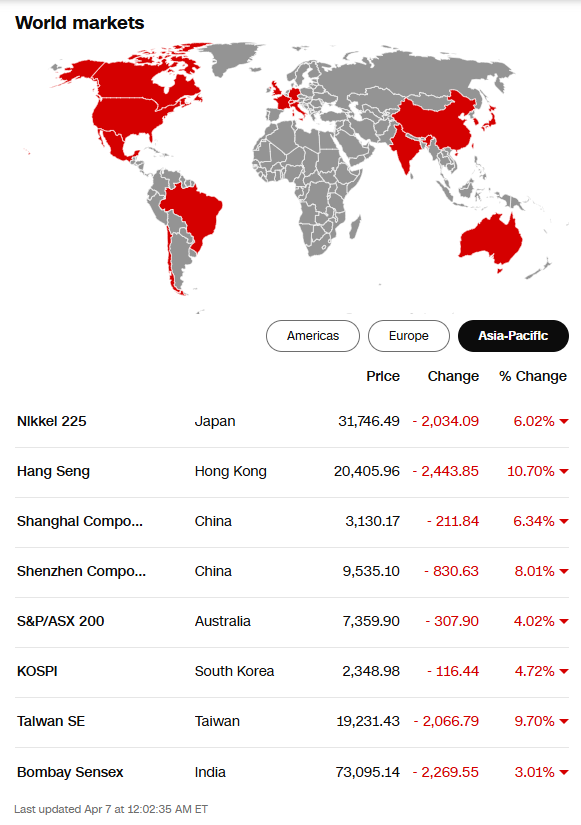 4 月 7 日,由美国关税引发的全球贸易战持续打击市场,周一早盘美股期货快速走低,恐慌指数期货暴涨,亚洲股市重挫,铜油暴跌,避险情绪驱动美债、日元、瑞郎走高,黄金跌破 3000 美元后快速反弹。
