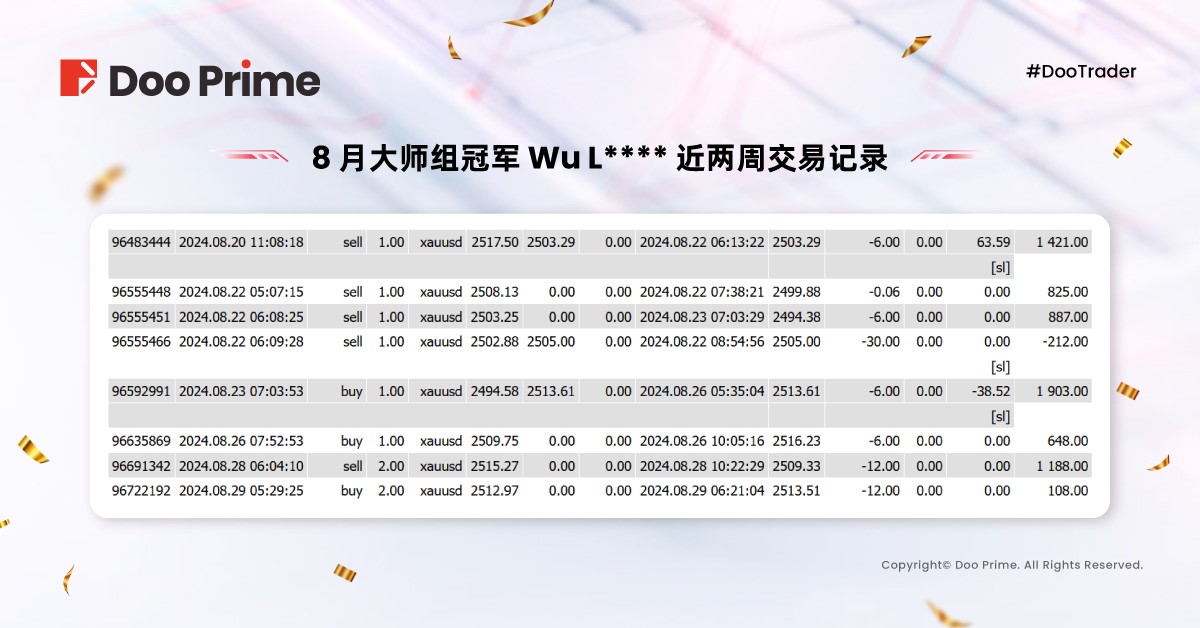 Wang M**** 先以 MT5 账户参赛大师组,并在完成交易三周之后,再使用一个 MT4 账户报名经典组。这位选手在经典组的 42 笔交易、合计 665 手的交易手数中,实现了将近 12 倍收益率的雄厚利润,一举拿下 2024 #DooTrader 慈善杯 8 月赛事的经典组冠军!