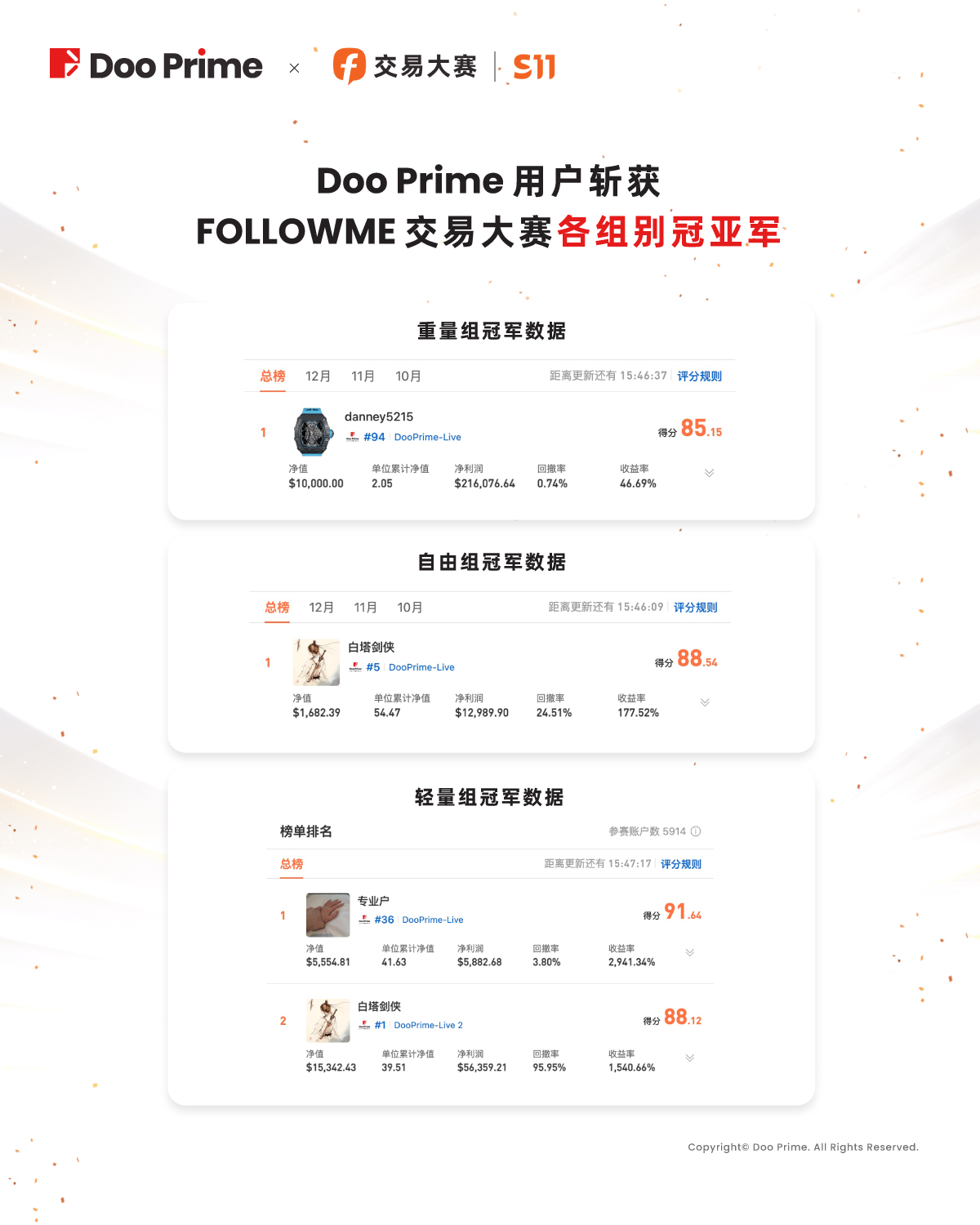 本次 FOLLOWME S11 交易大赛分为轻量组、重量组和自由组三大组别,吸引了众多高手争相竞逐,让我们一起恭喜各位取得优异战绩的选手,比赛获奖榜单如下: