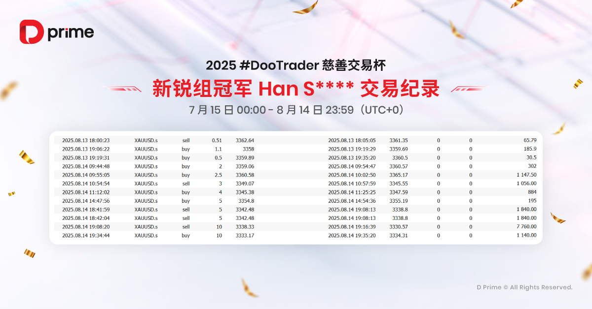 2025 年 D Prime #DooTrader 慈善交易杯首轮月赛于 8 月 14 日 23:59(UTC+0)圆满落幕,第一轮榜单已火热出炉!第二轮月赛紧随开启,已于 2025 年 8 月 15 日 00:00(UTC+0)鸣锣开战 —— 欢迎各路交易高手即刻报名,争夺决赛入场券!