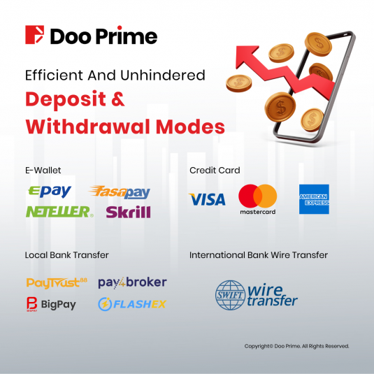 There are multiple deposits and withdrawal methods to choose from at Doo Prime. Our deposit mode includes International Bank Wire Transfer, Local Bank Transfer, E-Wallet, and credit card.