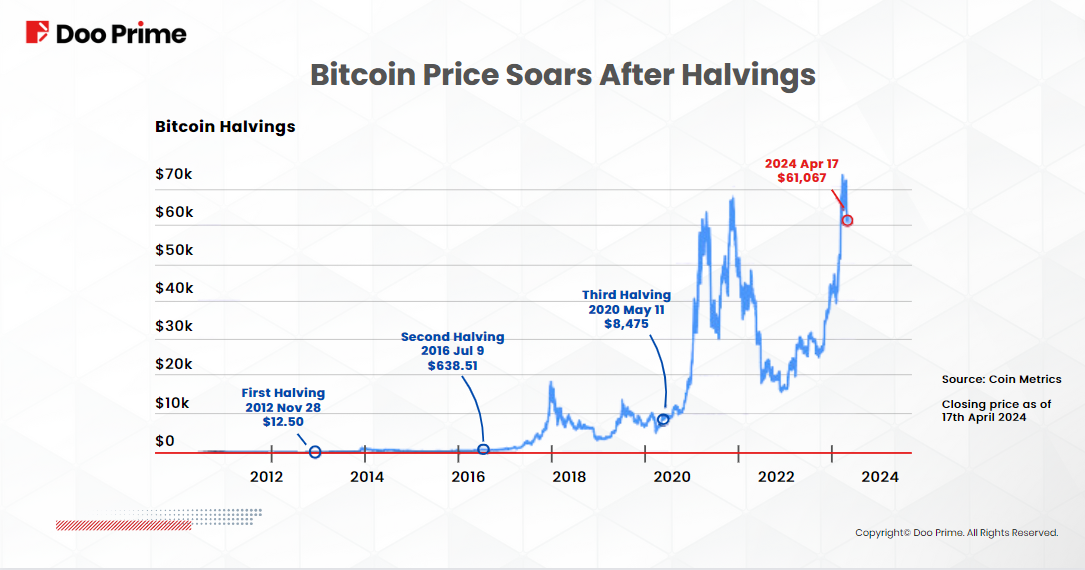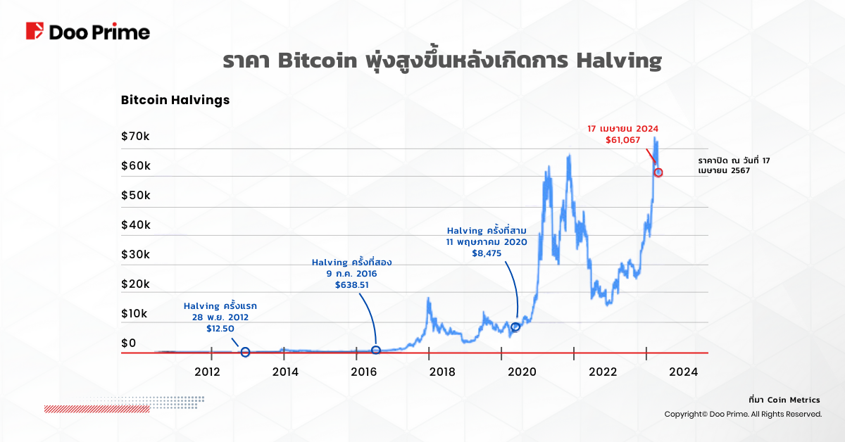 ข้อมูลในอดีตเผยให้เห็นแนวโน้มที่น่าสนใจ คือ ราคา Bitcoin มีแนวโน้มที่จะพุ่งสูงขึ้นหลังจากเหตุการณ์ Halving เราสามารถเห็นได้อย่างชัดเจนในแผนภูมิด้านบน ซึ่งแสดงให้เห็นถึงราคาที่เพิ่มขึ้นอย่างน่าตกตะลึงหลังจาก Bitcoin Halving แต่ละรอบ แม้ตอนแรกราคาจะดูนิ่ง แต่มูลค่าของ Bitcoin ก็เพิ่มขึ้นอย่างต่อเนื่องในช่วงหลายเดือนและหลายปีหลังจากเหตุการณ์ Bitcoin Halving   ซึ่งตอกย้ำสถานะของ Bitcoin ในฐานะแหล่งเก็บมูลค่าและสินทรัพย์การลงทุน