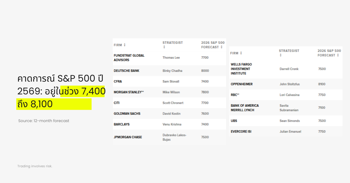 - Morgan Stanley, Goldman Sachs, JPMorgan, Citi และ UBS อยู่ในช่วง 7,500 ถึง 7,800 จุด