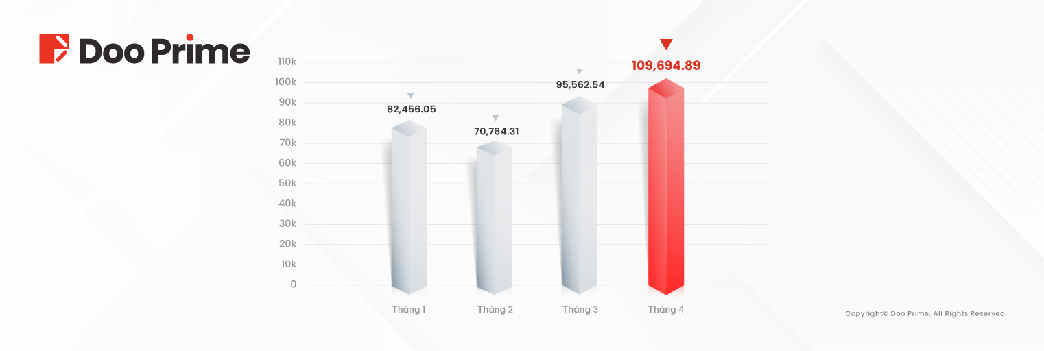 Theo như báo cáo, tổng khối lượng giao dịch của Doo Prime trong tháng 04 năm 2024 được ghi nhận ở mức 109.69 tỷ USD, tăng 14.79% so với tháng trước. Đáng chú ý, khối lượng giao dịch trung bình hàng ngày (ADV) trong tháng 04 đạt mốc 3.66 tỷ USD, tăng 18.61% so với hồi tháng 3.