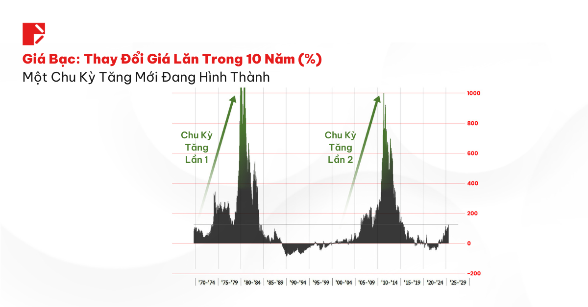 Vùng kháng cự ngang quanh mức 44–50 đô la đã hạn chế đà tăng của bạc trong hơn bốn thập kỷ: Một lần vào năm 1980, một lần nữa vào năm 2011. Và bây giờ, vào năm 2025, thì kim loại này đang lao trở lại vùng đó.