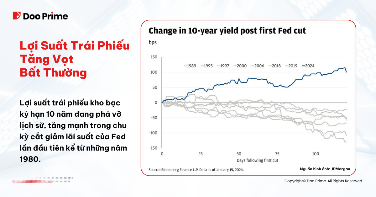 Sự gia tăng lợi suất trái phiếu kỳ hạn 10 năm rất đáng chú ý vì nó diễn ra đồng thời với chu kỳ cắt giảm lãi suất của Fed. Theo lịch sử, lợi suất thường giảm trong vòng 100 ngày kể từ khi Fed bắt đầu chu kỳ nới lỏng, một mô hình đã được quan sát từ những năm 1980. Tuy nhiên, lợi suất hiện cao hơn khoảng 100 điểm cơ bản so với mức thấp vào tháng 9 năm 2024, rõ ràng đi lệch khỏi hành vi thông thường.