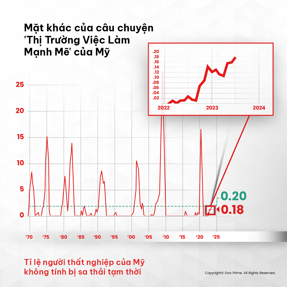 Theo tiền lệ, khi sự chênh lệch tăng vượt mức 0.20%, đó là một dấu hiệu cảnh báo suy thoái. Hiện tại, chúng ta đang ở mức 0.18%, một con số đáng ngại. Mặc dù chưa chạm vùng suy thoái, nhưng những con số này đã cho thấy phần nào sự khó khăn của thị trường việc làm hiện tại.